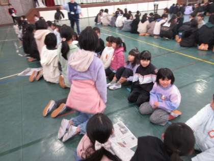 総務委員が主催するお楽しみ企画「にじいろデー」を行いました。本日は2年生と6年生が体育館でお互い自己紹介をした後、「新聞乗りゲーム」をしました。普段は、関わりの少ない学年同士ですが、声をかけあってとても楽しそうに過ごしていました。