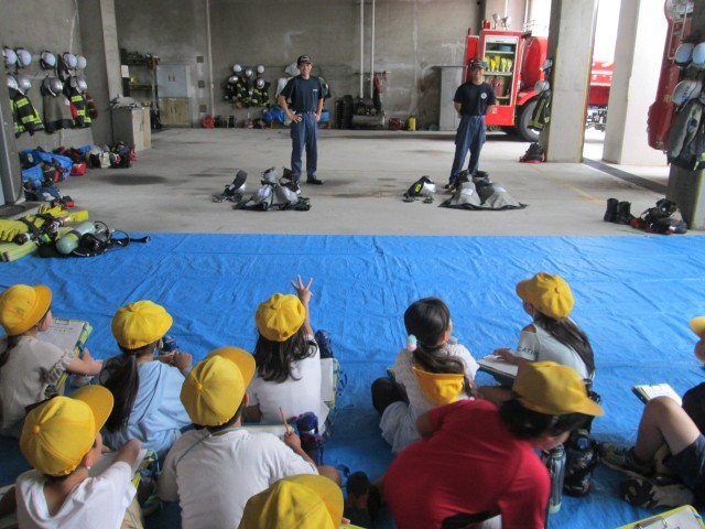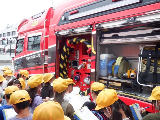 また、消防活動に使われるさまざまな車についても詳しく説明していただき、子どもたちは興味をもって聞いていました。