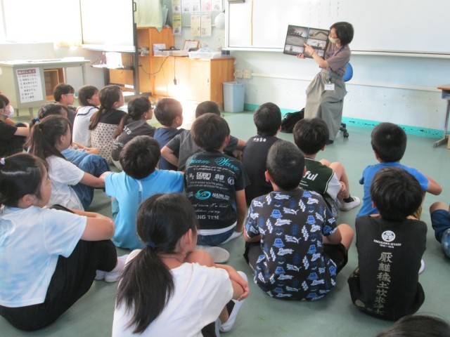 今日は2年生と4年生とおおぞらで読み聞かせをしていただきました。