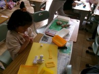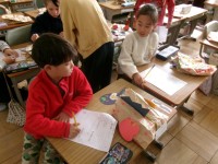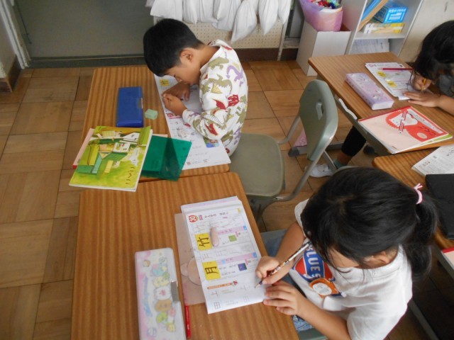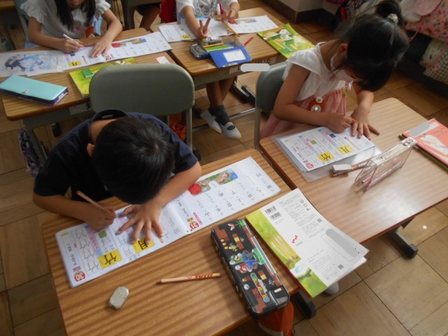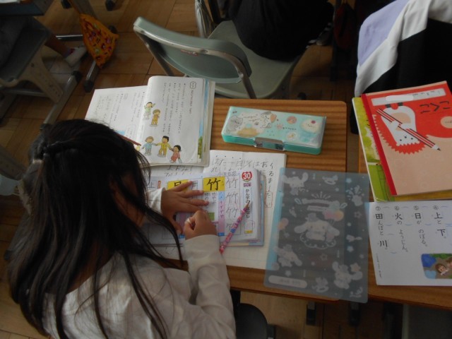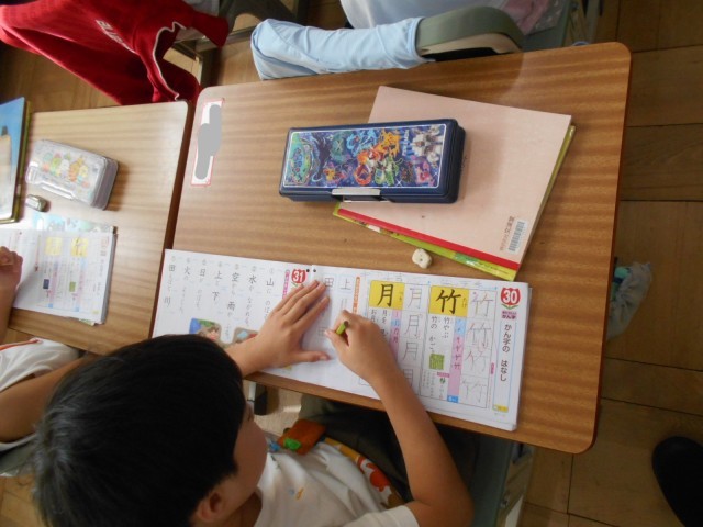 『月』を学習しました。書く際の注意点を担任の先生から教えてもらった後、練習帳に丁寧に漢字を書きました。
