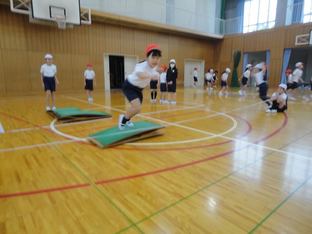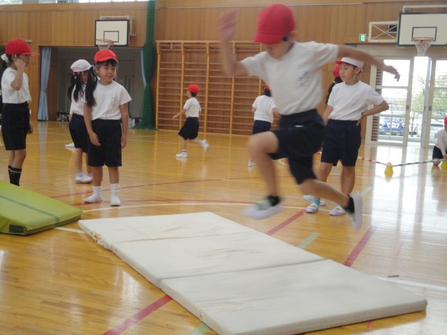 2組・3組で合同体育を行いました。ゴムひも・跳び箱・コーンバー&ミニコーン・ロイター板・ケンステップ・マットを使って6つの場をつくり,運営側・跳ぶ側に分かれてチャレンジしました。