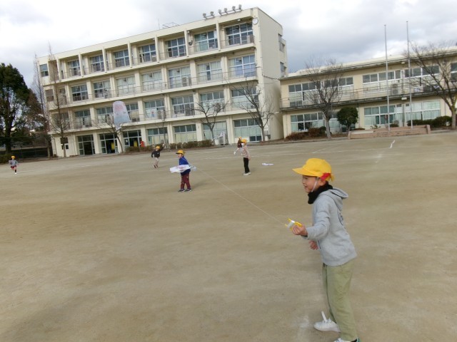2時間目は、いよいよ凧揚げの時間です。程よい風も吹いていたこともあり、皆凧あげに成功していました。