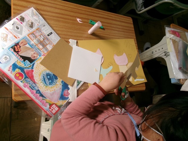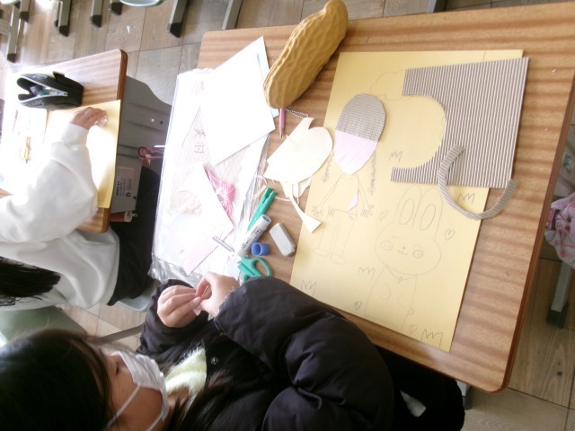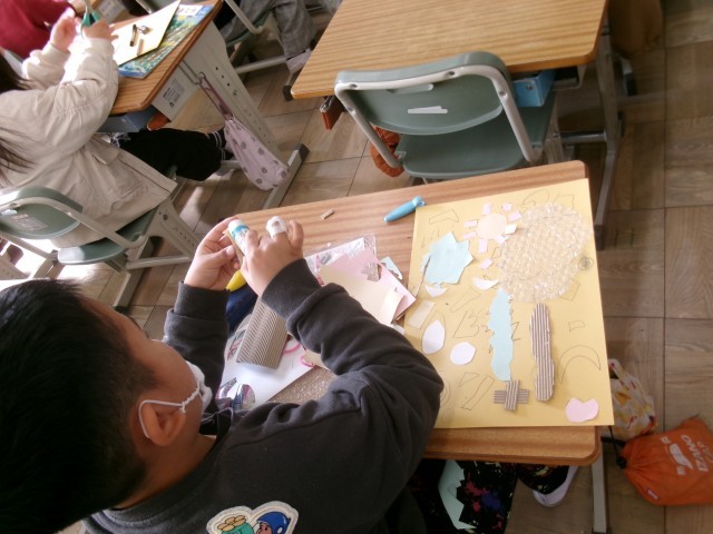 下絵を描き終わった児童から、絵の上に思い思いの材料を形に合わせて貼り付けました。