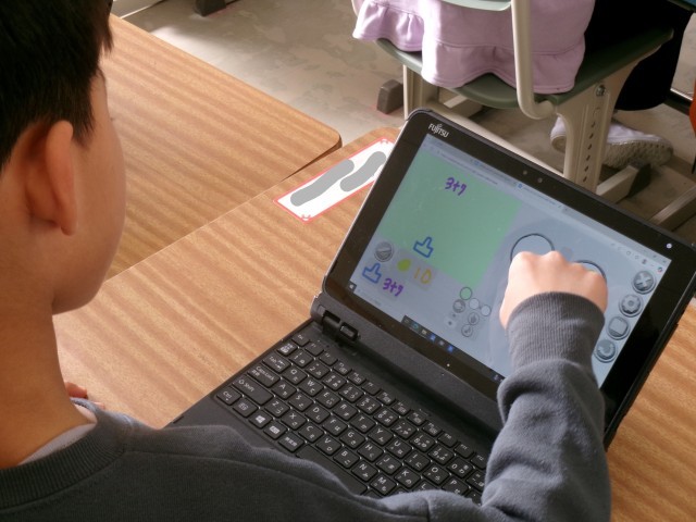 初めに ICT支援員から、プログラミングについて説明を受けた後、たし算の式にボールを当てると答えが出るというゲームをプログラムし、実際にボールを動かしてみました。