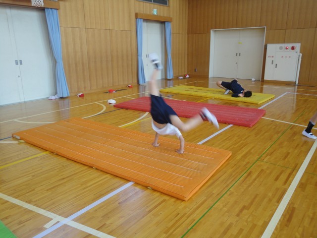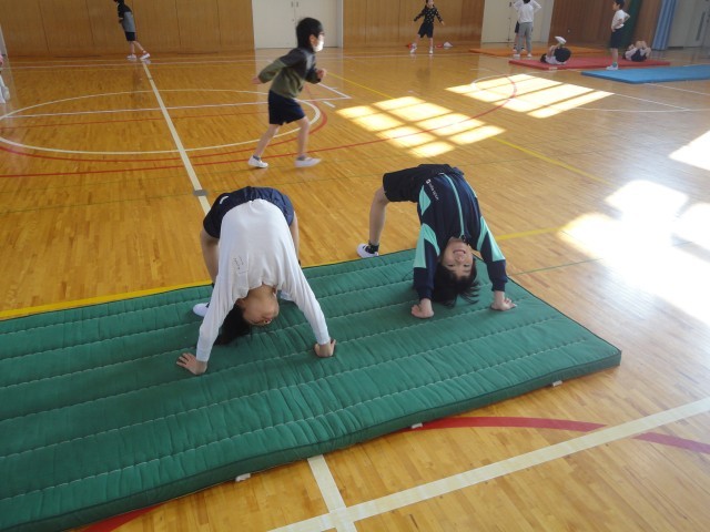 前転や後転などの基本技を復習した後,開脚と伸膝,側転にも挑戦しました。いろいろな技に親しみ,まとめとして「今できる最高の技」を披露し合いました。