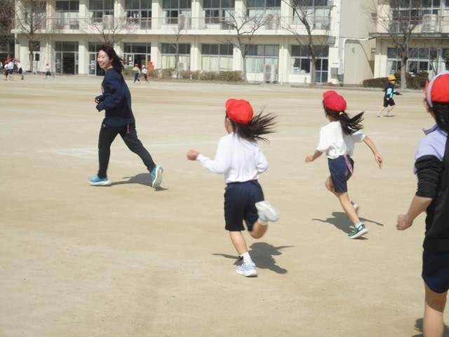 2年生,最後の外体育は「しっぽ取り」と「氷鬼」をしました。黄色帽子・赤帽子・白帽子の三色・三すくみのルールで行い,白熱した戦いが繰り広げられました。今回は特別に体育専科の先生もゲストとして参加し,3分以上も追撃をかわし続けていました。