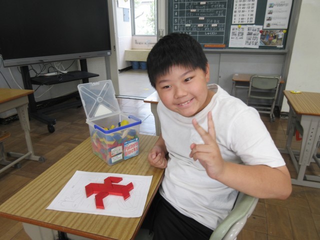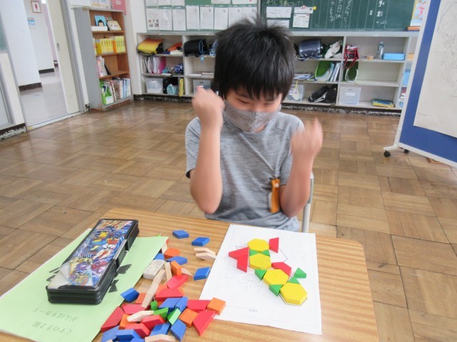 くすのき2組では、パターンブロックを使って算数の図形の勉強をしていました。三角形やひし形、六角形などの特徴をよく見て組み合わせていました。図形が完成して、とてもうれしそうですね。今度はどんな図形ができるか楽しみです。