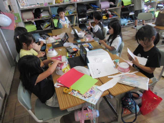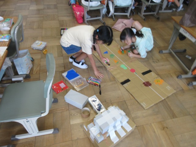 自分の家から材料を持ってきて、自分たちでおもちゃ作りを行っている様子です。