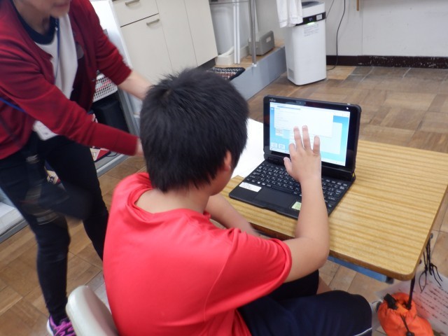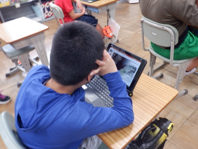 授業参観の日の発表に向けて、タブレットを使い、パワーポイントやスカイメニューで準備しています。