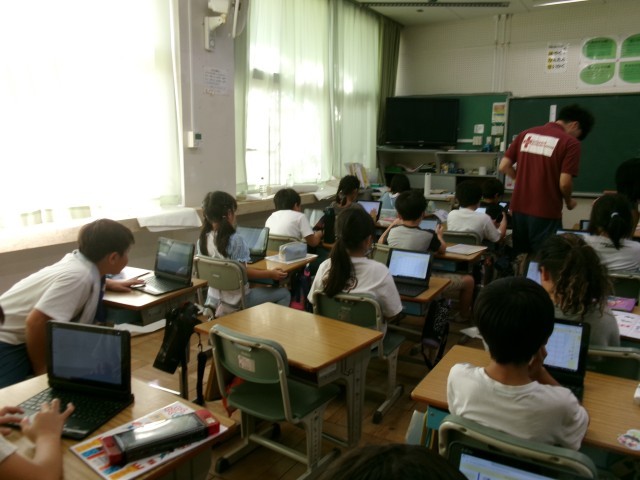 3年生の教室では、最初にタブレット端末を使って、「運動会の意気込み」をローマ字入力で書き込んでいました。