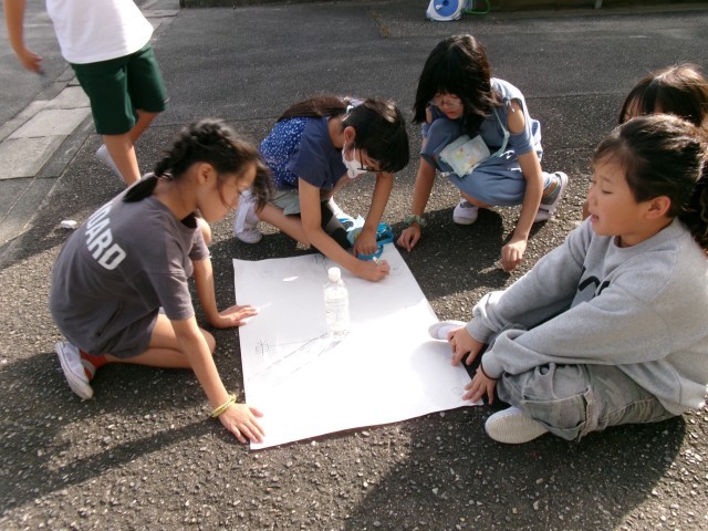 書き終わった後は、「太陽の動き」を理科で学習中なので、午後の様子を観察していました。大きな用紙に影を映しています。