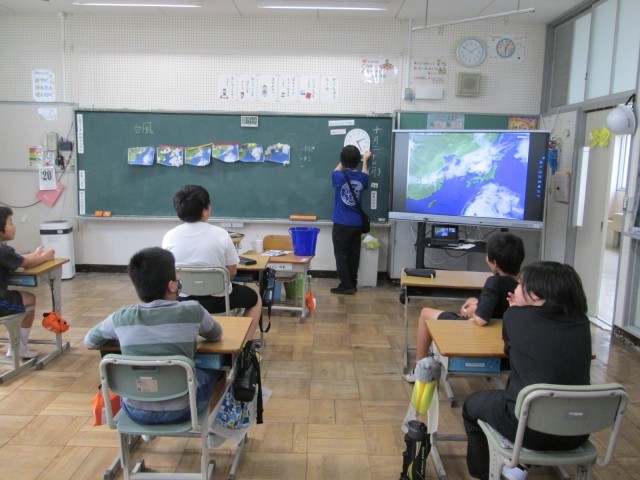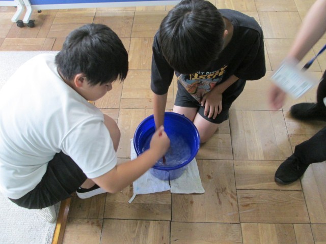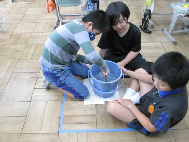 くすのき2組では天気図を見て台風について学んでいました。反時計回りにぐるぐるお水と紙をかき回し、台風の目を確認していました。