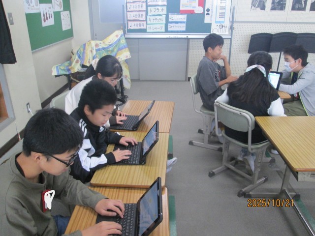 今日の音楽は、歌唱の授業でした。「ぼくらの日々」「明日を信じて」の2曲の中から好きな方を選んで、曲のよいところが同じ仲間同士でグループを作りました。コラボノートにたくさんよいところを書き込んでみんなで共有しています。「何より歌詞がよい」「リズムが弾んでいるところがよい」「強弱の盛り上がりが気持ちとあっている」最後は自分の歌になって素敵な歌になると思います。