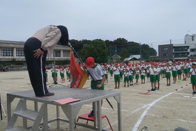 優勝旗授与では、今年度勝利を収めた赤組団長の児童に、優勝旗が手渡されました。