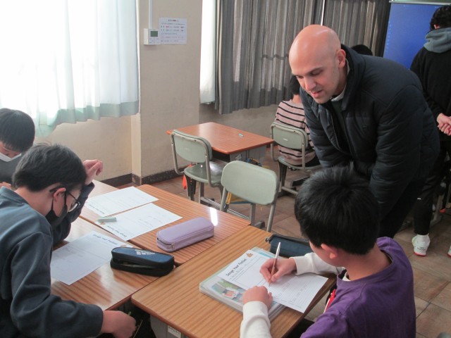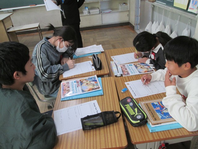 その後、6年生は自分たちの住んでいる日本の紹介を英語で考えました。グループで相談しながら英語を紙に書き、とても楽しそうに交流していました。