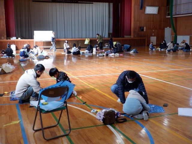 多くの保護者の方々、児童が体育館で凧作りに挑戦しています。