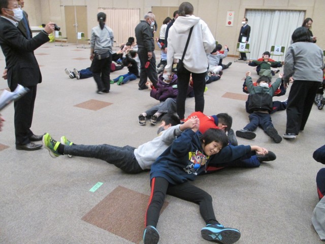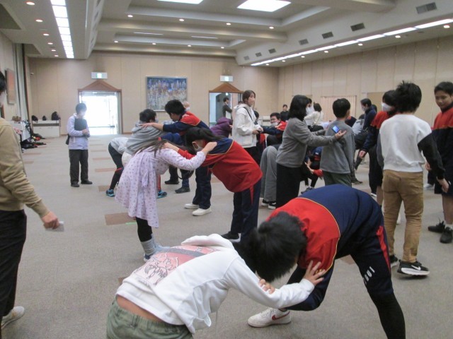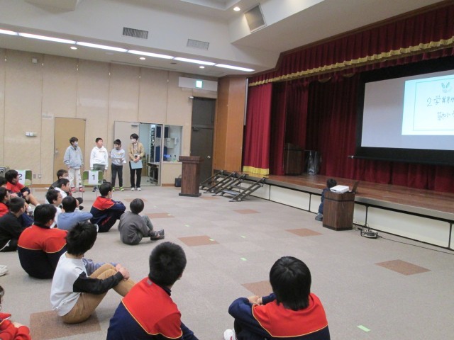 エスペランス丸山にて、阿久比中学校、町内の4小学校が集まって交流会が行われました。授業でどんなことをしているのかスライドで紹介し合ったり、一緒にゲームやストレッチをして交流をしました。草木小学校の児童は司会を務めました。何度もセリフを練習した成果が出ていました。