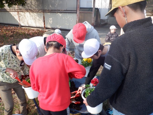 3月の卒業式と4月の入学式に向けて、1人ずつ花植えに参加しようというねらいのもと、行われています。