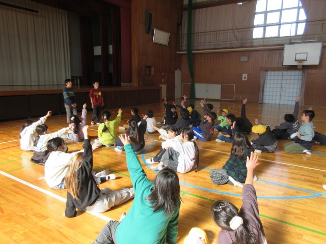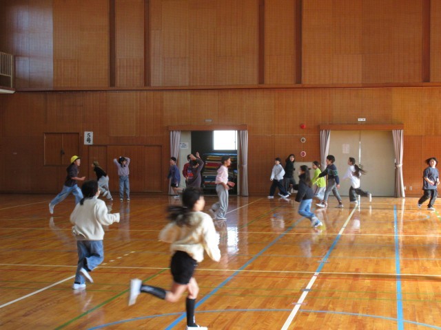 体育館でお楽しみ会をしました。今回は、ドッジビーとバナナおに。