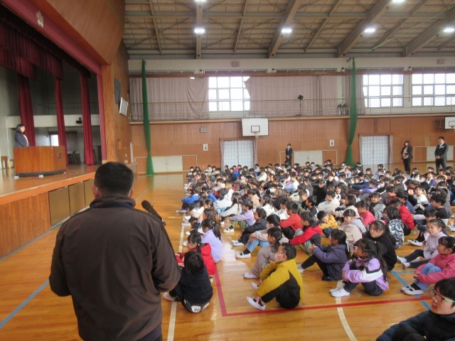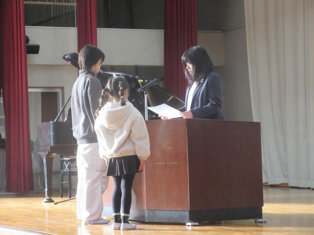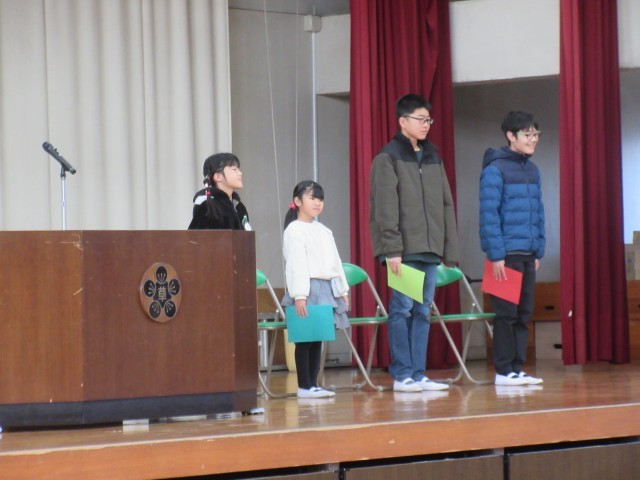 終業式とその後に行われた表彰、スピーチの様子です。終業式では校長先生から2学期の皆さんの様子のお話と、冬休みに気をつけることのお話がありました。表彰ではたくさんの児童が壇上で賞状を受け取り、スピーチは2年生と6年生の児童4人が2学期にがんばったことを話しました。