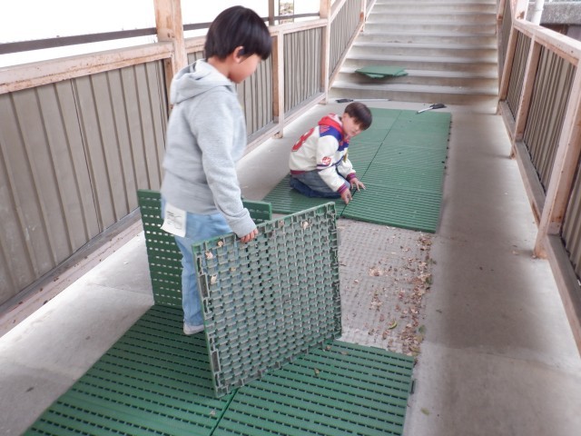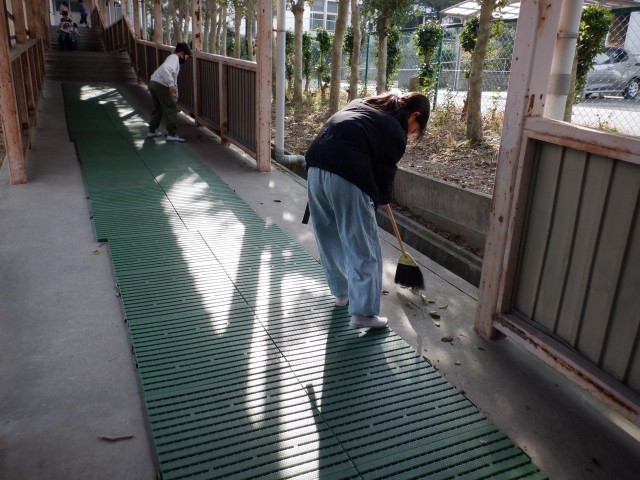 体育館につながる渡りは、とても寒い掃除場所ですが、担当の子たちは一生懸命、掃除をしています。