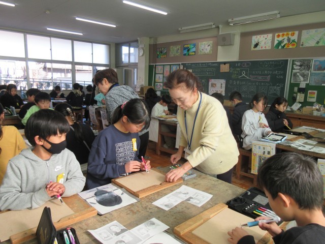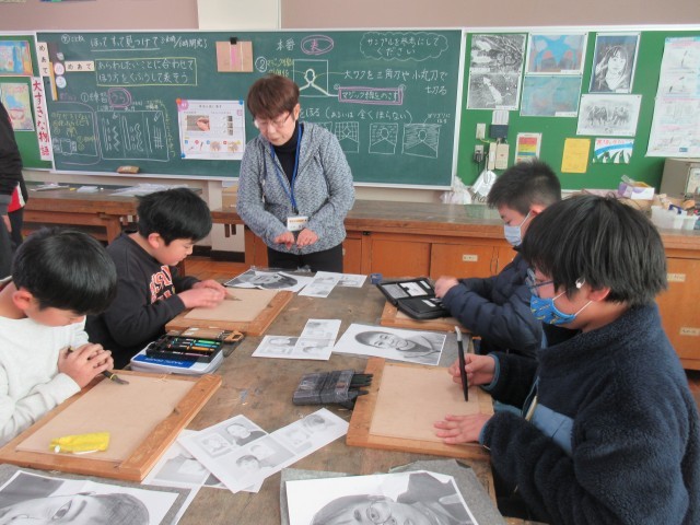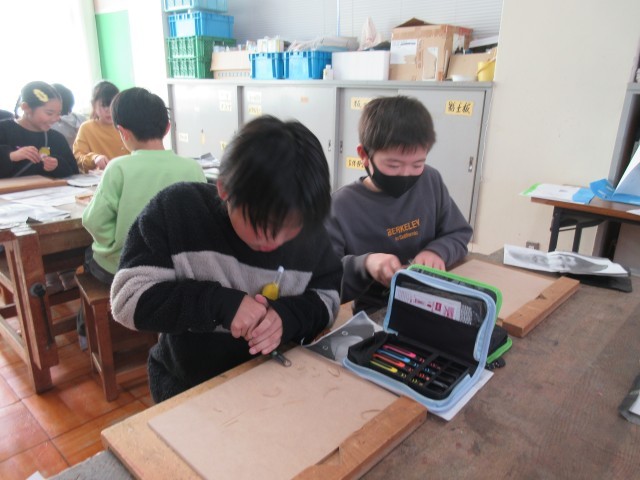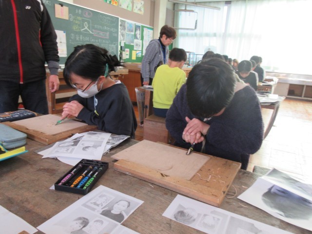 ボランティアの方にもご協力いただき、版画を彫り始めました。