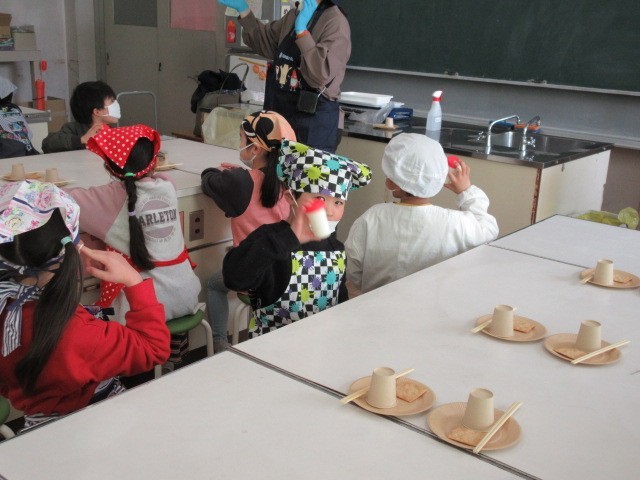 3・4時間目に、雪印メグミルクさんによる「牛乳の大切さを知ろう」という授業を行ってもらいました。牛乳にはたくさんの栄養素が入っており、飲むと骨を作ったり、体を強くしてくれたりすることを教えてもらいました。その後、家庭科室で生乳を使って、バター作りを行いました。友達と協力して容器に入ったクリームを振り続けると、見事バターが出来上がりました。バターを作ったときにしか出ないバターミルクも試飲し、みんなで出来立てのバターも食べました。これからも給食の牛乳をたくさん飲みたいですね♪