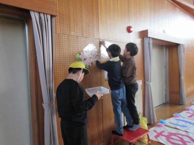 卒業式のために、みんなで体育館の飾りつけをしました。