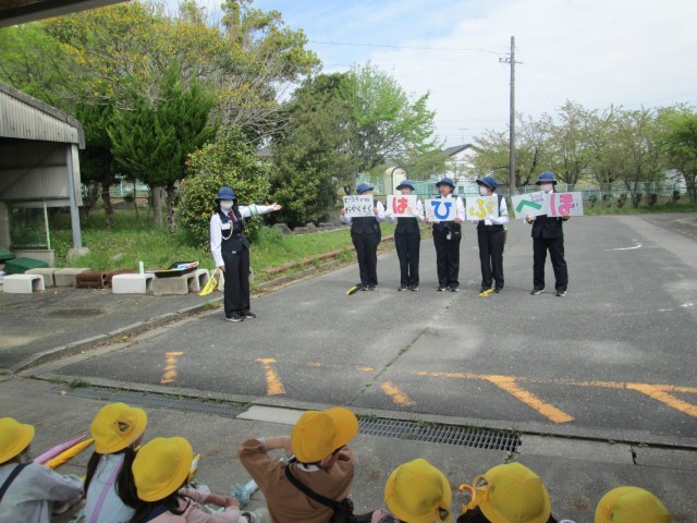 初めに交通指導員さんから「どうろでのおやくそく はひふへほ」を聞いた後、実際に道路を歩いてみました。