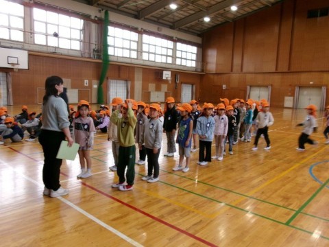 地震時に安全に素早く避難できるように、また新しい自分の教室からの避難経路を確かめるために、地震避難訓練を行いました。本来ならば運動場に避難するのですが、あいにくの天候のため体育館に集まりました。「おはしも」を守り、素早く静かに全校児童が集合することができました。