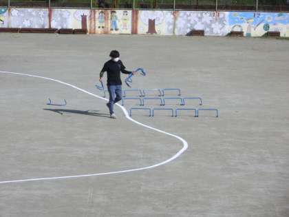 運動場では、先生が準備をしていました。