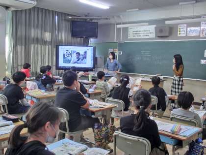 5−2では、英語の時間です。町で道を尋ねられた場面のようです。どこまでの道を尋ねられたのかな。英語で会話しています。最後には地図記号で確認です。すごいなあ・・・