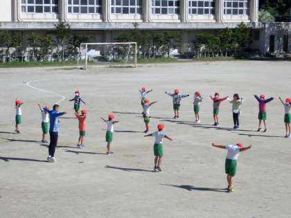 先生の号令でラジオ体操が始まります。指先までぴんと伸びていて、見ているこちらも背筋が伸びました。