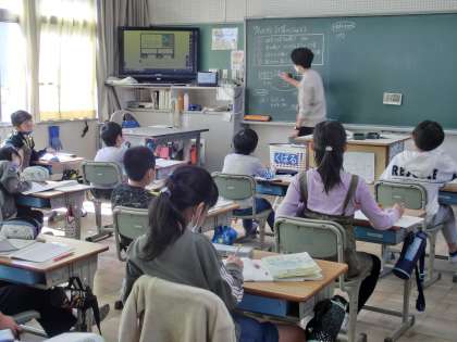 (上の写真)3年生の算数です。問題文をもとに、関係図に表して考えています。途中で先生からヒントがありました。すると、「あ、そうか。」「わかった!」という声。笑顔で続きを解いていました。