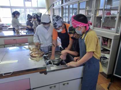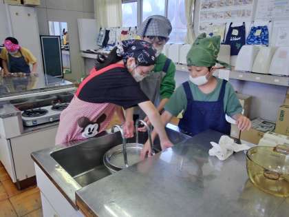 5年生が家庭科室にいます。エプロン、三角巾をつけていました。