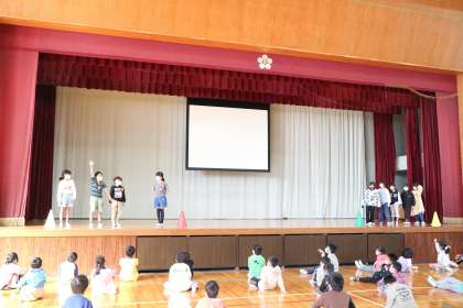 先日までは教室でグループごとに発表の原稿を作ったり,発表の練習をしていましたが,今日から体育館での練習が始まりました。