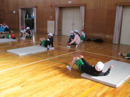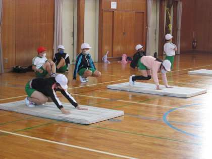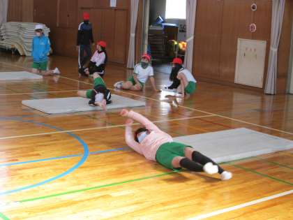 体育館では5の2が体育の授業で、「クモ歩き」や「うさぎ跳び」などのマット運動をしていました。中には超高速で回転をする男子児童もいるなど、楽しそうな雰囲気で活動をしていました。