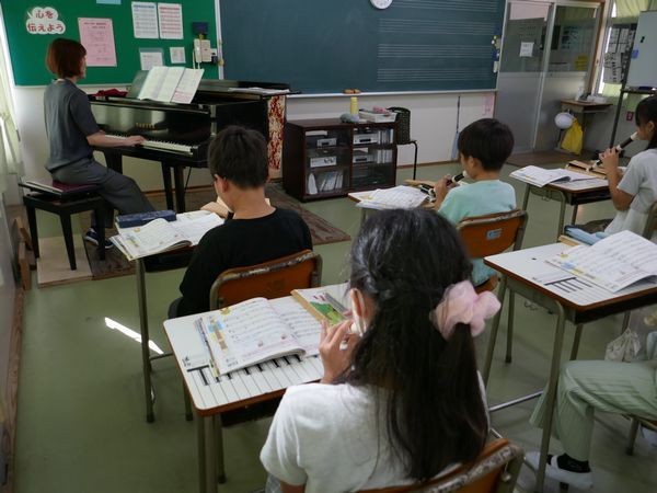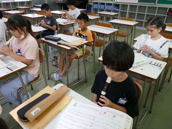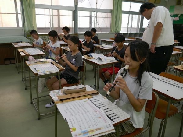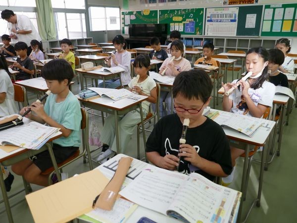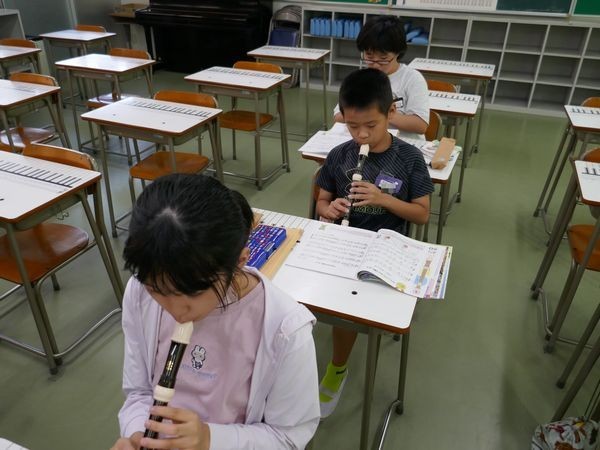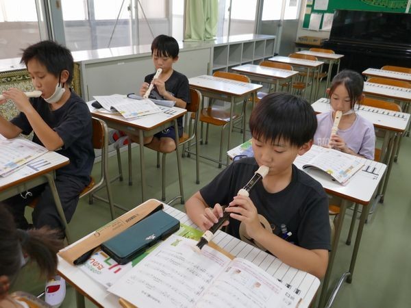 4年1組の音楽の時間、歌を歌った後はリコーダーの練習です。今日の曲は「ハロー サミング」。高いミの音を出すために、左手の親指を半分ずらす練習曲です。