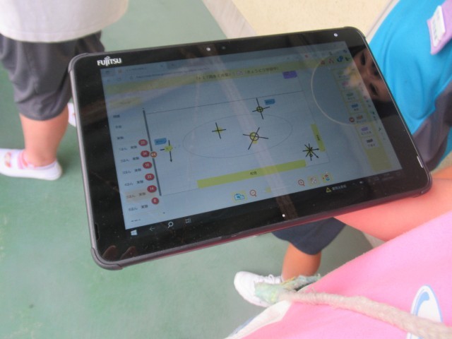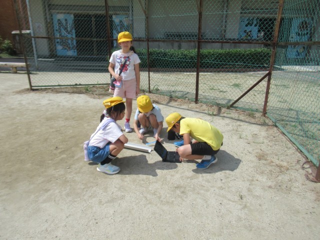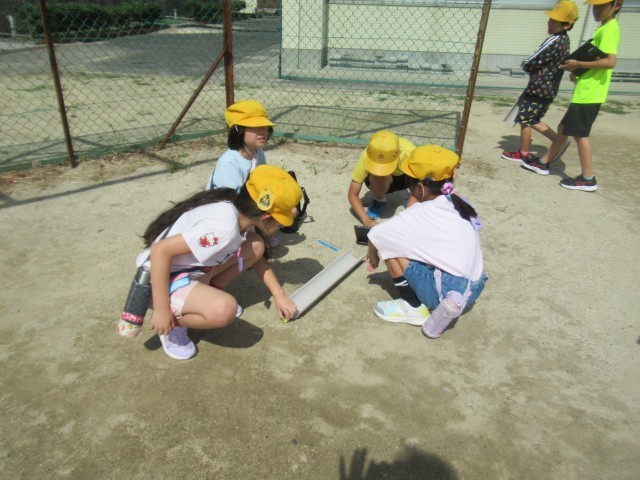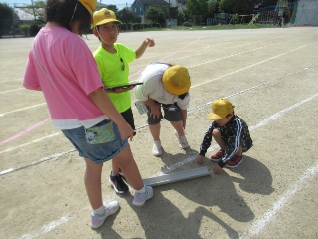 雨どいを運動場に置き、そこにビー玉を置いて、どちらの方向に進むのかを調べることで、運動場の傾きを調べていました。