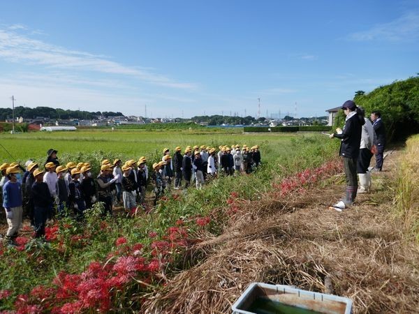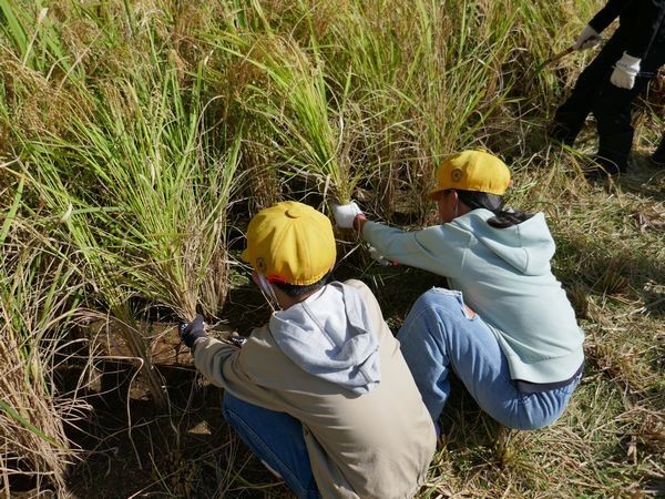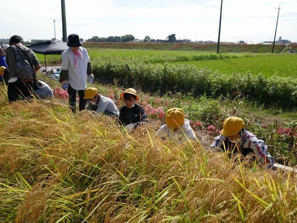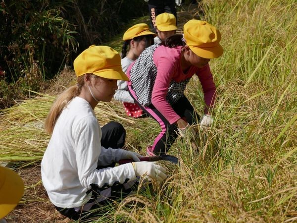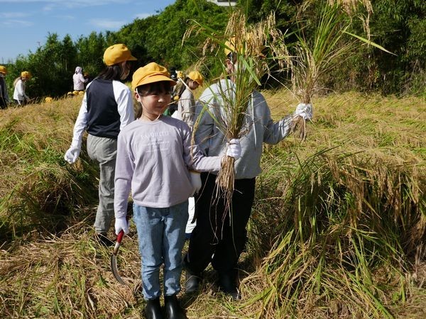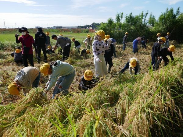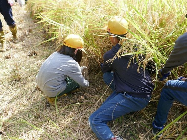 子ども達は田を貸してくださっている竹内さんやJAの方に稲の刈り方を教えていただいた後、いよいよ開始です。