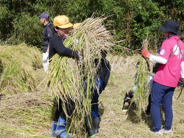 最初は「切れない!」「クモだ!」と大騒ぎでしたが、段々と手馴れてきて、すごいスピードで刈り進めることができました。最後に竹内さんがコンバインで、子ども達が刈った稲から籾を取り出してくれました。自分たちで植え、刈った米を手にし、満足そうな子ども達でした。