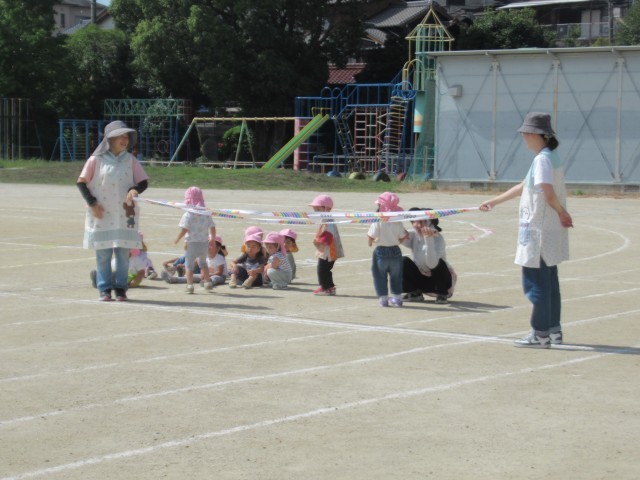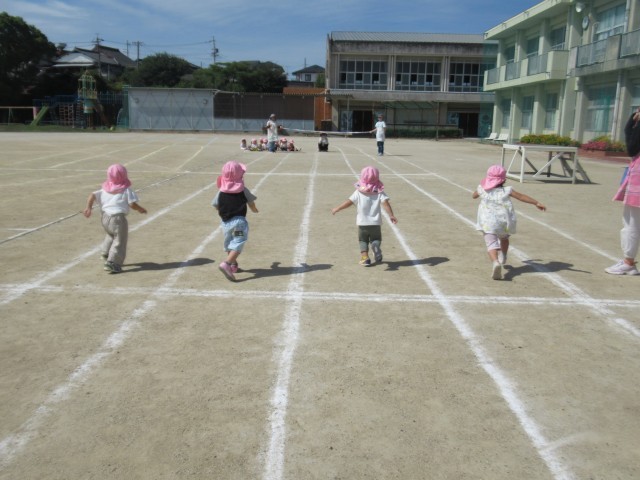 徒競走では、先生が名前を呼ぶと大きな声で返事をして、スタートラインにつきました。スタート合図でみんな一斉に走り出し、ゴールテープに向かって駆ける姿は、世界陸上を見ているようでした。