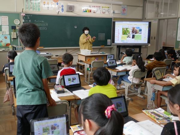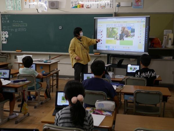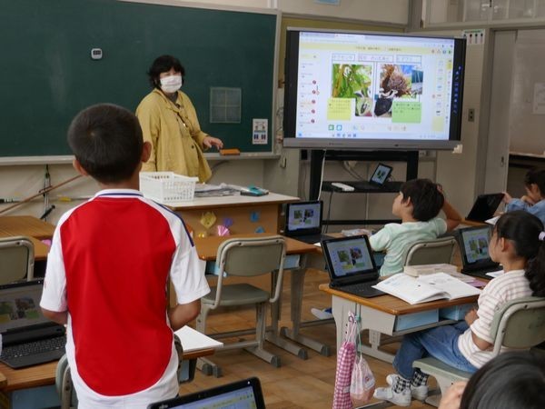 子ども達それぞれがタブレットでまとめたものが大型モニターに映し出され、花の咲いた後の同じところと違ったところを発表しました。
