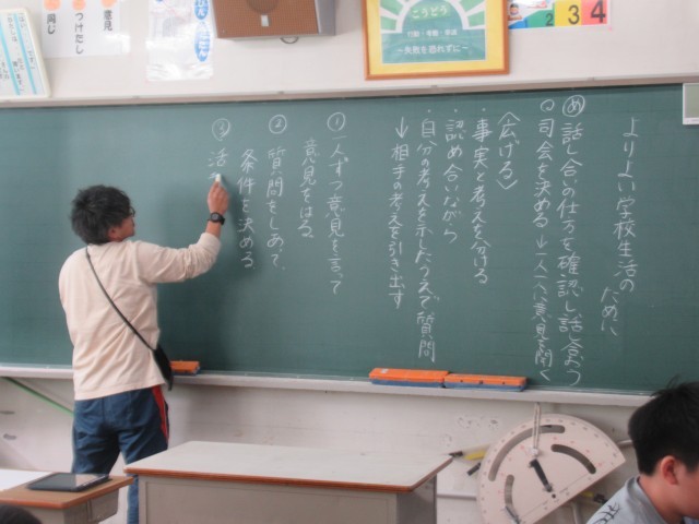 まず、黒板に書かれた「話し合いの仕方」を確認しました。「事実と考えを分ける」「自分の考えを示した上で質問する」「相手の考えを引き出す」など、より建設的な話し合いを進めるための心構えと手順を共有しました。