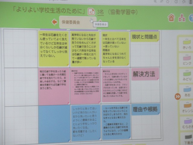 保健委員の話し合いでは、「低学年と高学年で石けんの使用量に差がある」という現状から問題点を見つけ、その解決方法や根拠を、協働学習ツールにまとめていました。 協働学習ツールを使うことで、各自の考えを整理しやすく、グループ全体で意見を共有しながら協働的に学習を進めることができていました。
