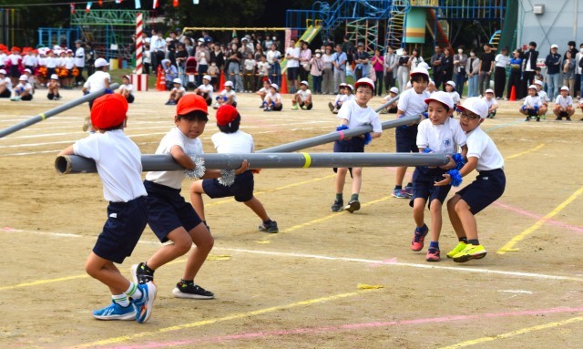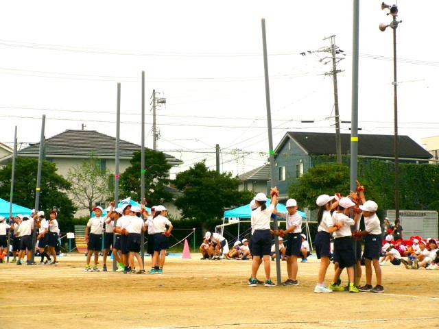 3・4年生の学年種目です。ウルトラ級のあつい魂、棒引きの棒をB'zの曲名「ultrasoul」に合わせて、種目名を「ウルトラ棒’z」という名前にしました。誰よりも早く得点の高い棒をねらって駆けだしました。