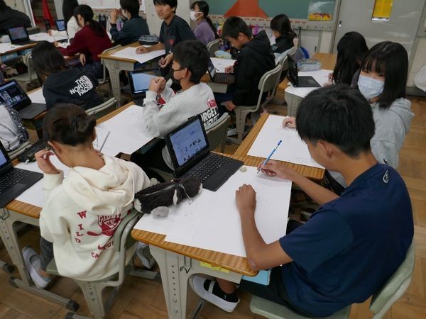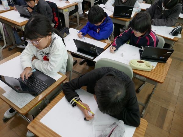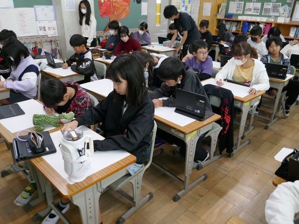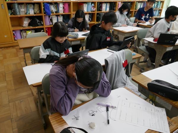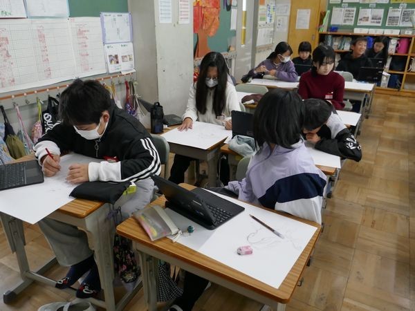 6年2組の教室では、読書感想画を描いていました。本の題名は「木を植えた男」。繰り返される戦争、それにもかかわらず、一人の男が30年に渡って続けた植樹による自然の再生。子ども達はこの本から何を感じ、どの場面が印象に残り、どのような作品を制作するのでしょうか。