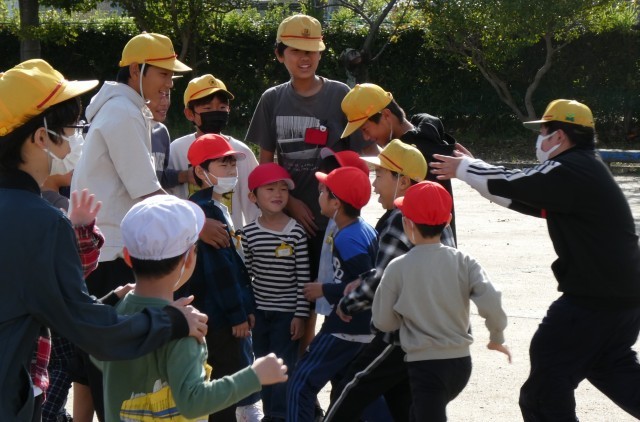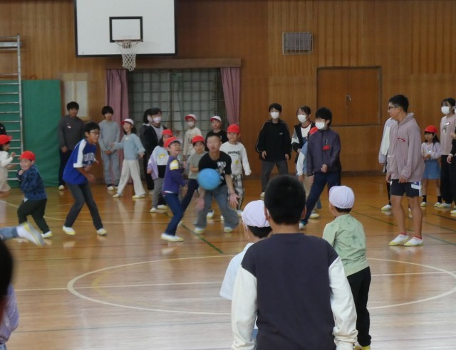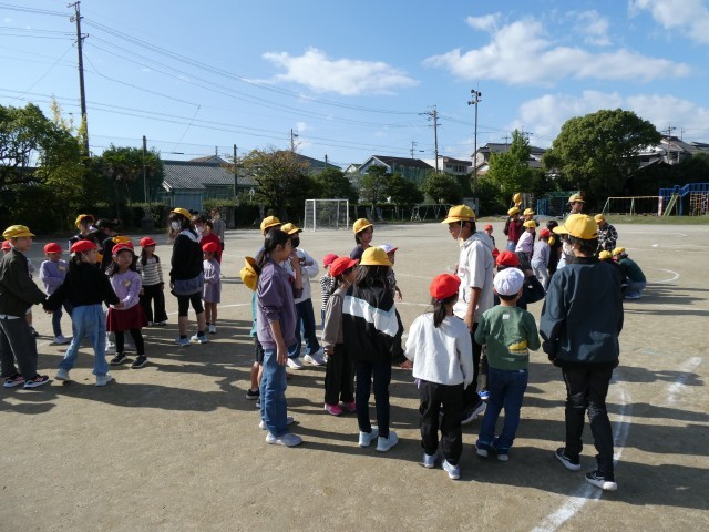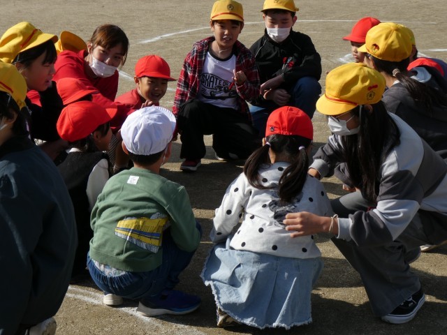 ペアで活動する中で、王様ドッジボールでは、ボールから逃げたり、6年生が1年生を守ったりしていました。猛獣狩りでは、お題の文字数に合わせて、ペアで集まれるように声をかけ合っていました。