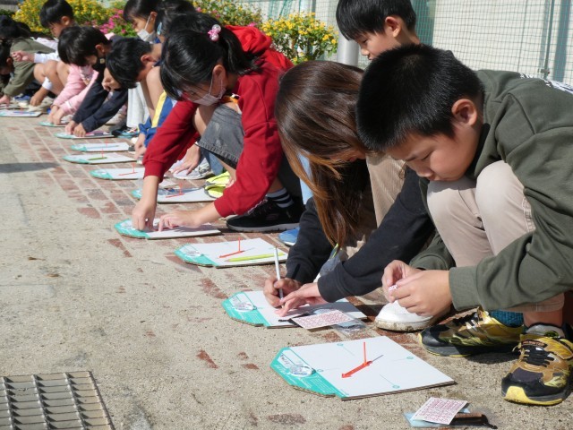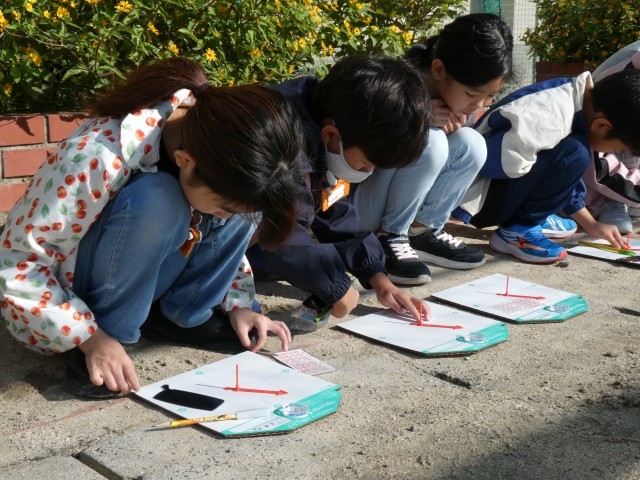 1日を通して、太陽が作る影の長さと位置を学習キットに記録をしていきます。かげの長さや向きが変化する様子を観察し、記録していました。