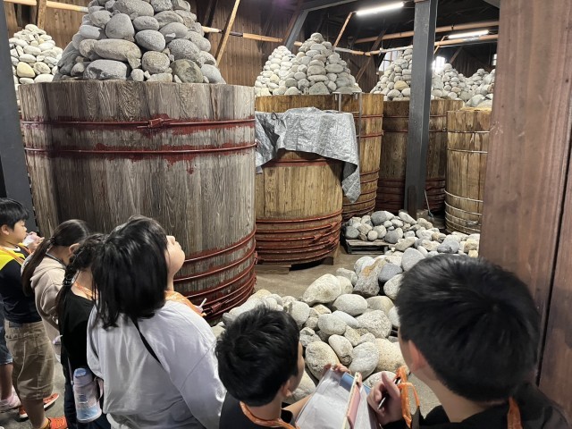 香りと迫力! 大きな木桶が並ぶ蔵の中は、みそのいい香りでいっぱいでした。何年もかけて熟成させる、伝統的な製法を知ることができました。